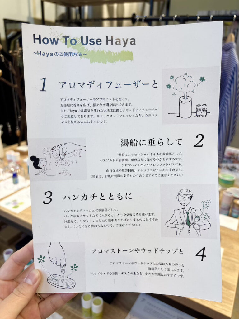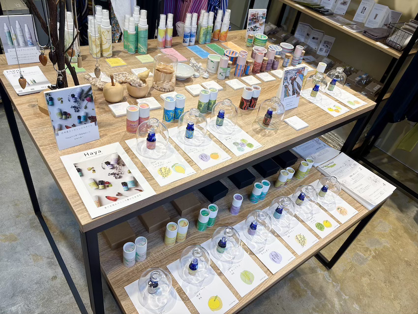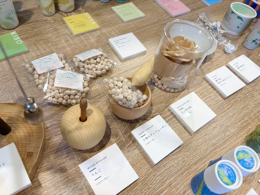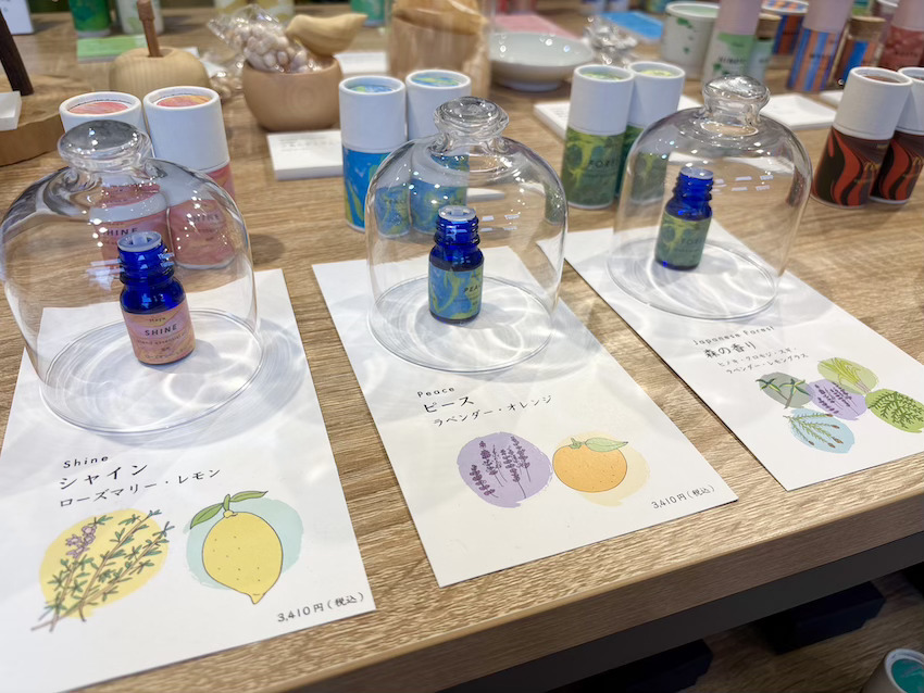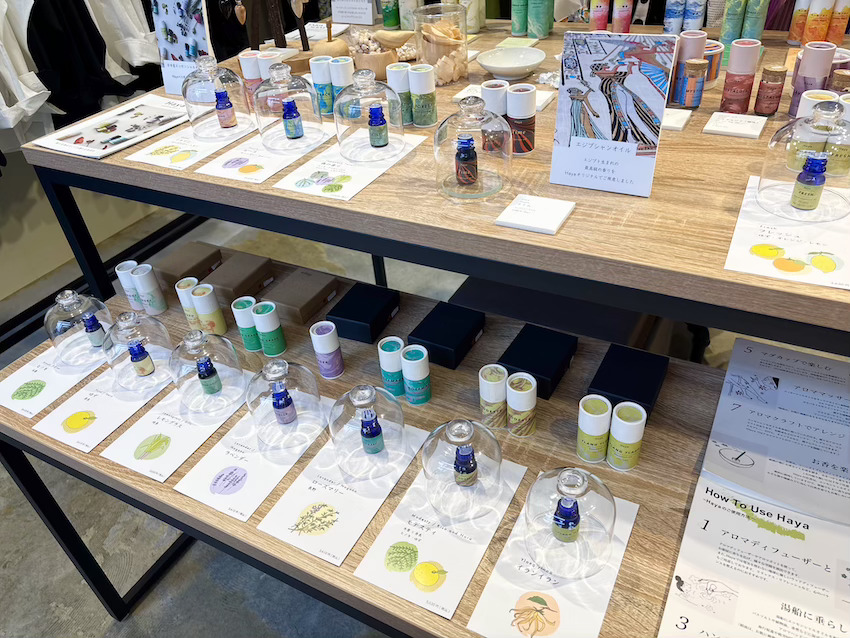 自然の素材を活かし、香りを通して“心と暮らしを整える”ことをテーマにしているそう。店内には、洗練されたデザインのボトルやアロマアイテムが並び、まるで小さな森のギャラリーのようでした。