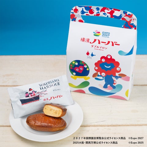 『ミャクミャク トゥンクトゥンク 横濱ハーバーダブルマロン』は、2025年大阪・関西万博の公式キャラクター「ミャクミャク」と、GREEN×EXPO 2027の公式マスコットキャラクター「トゥンクトゥンク」がパッケージにあしらわれた特別仕様です。地元横浜を盛り上げるべく、2026年に90周年を迎える株式会社ありあけの定番商品「横濱ハーバーダブルマロン」とのコラボレーションが実現しました。