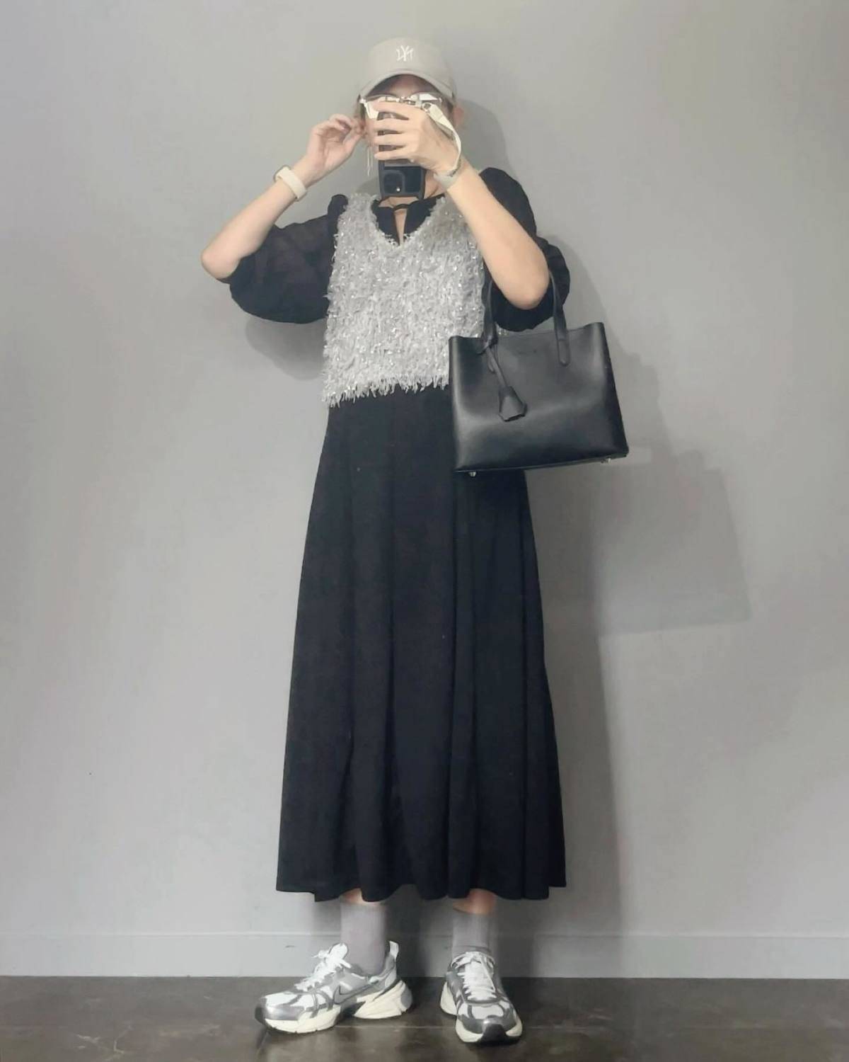 【秋編】垢抜ける黒ワンピースコーデ⑤白のバッグをアクセントにする♪
