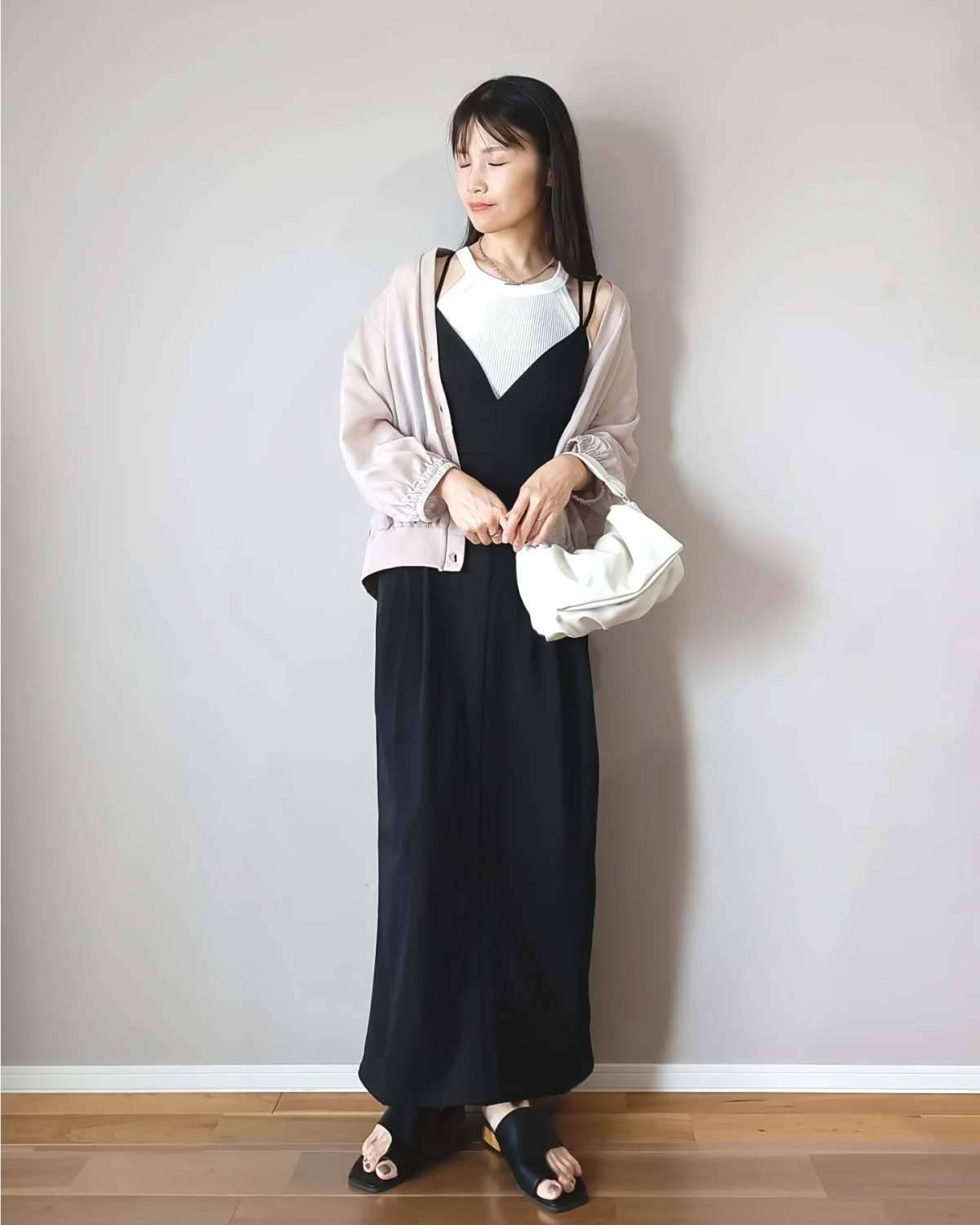 たくさん着まわせるキャミソールタイプの黒ワンピースは、1着持っていると秋も大活躍間違いなし!
