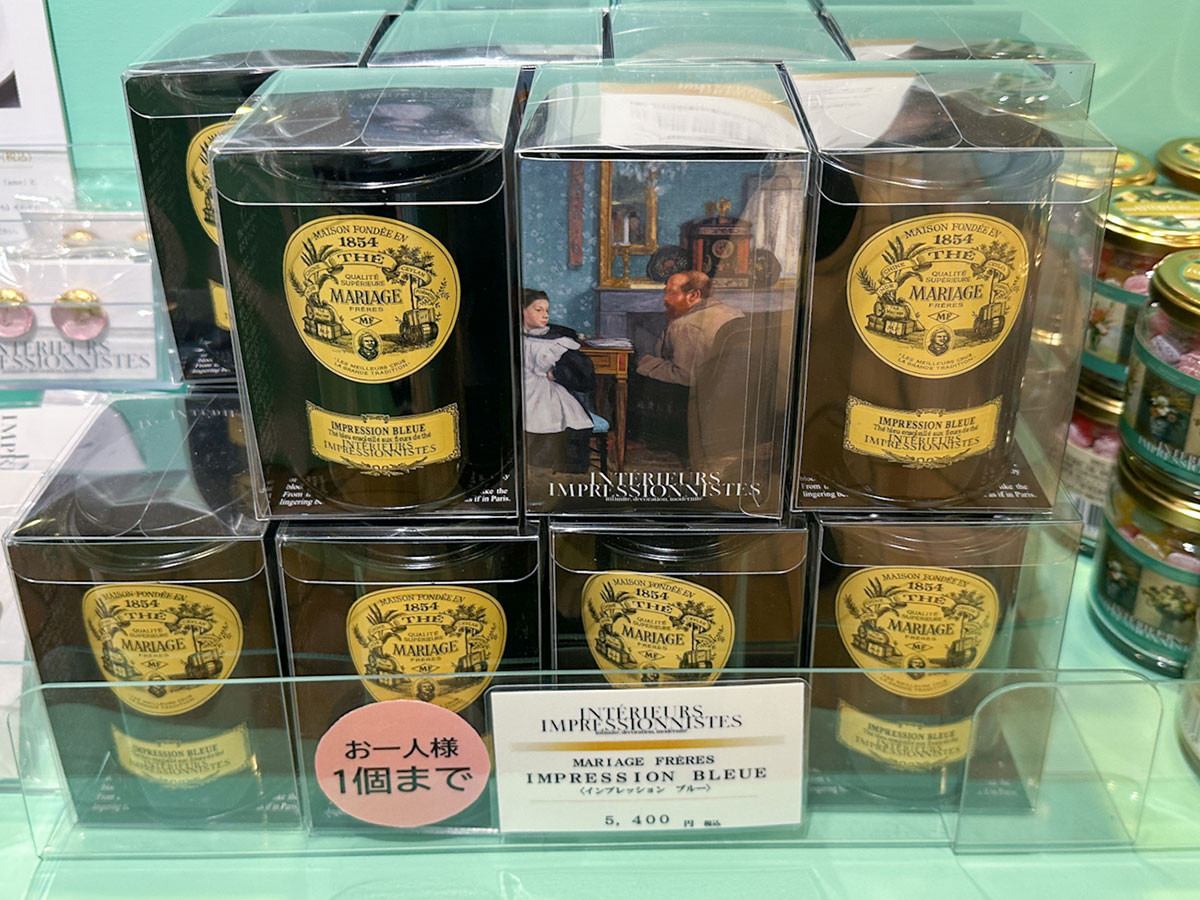 フランス流紅茶専門店マリアージュ フレールが展覧会のために創り上げたオリジナルブレンドのフレーバード ティー「IMPRESSION BLEUE」。優雅で香り豊かな一杯が、作品世界の余韻をそっと包み込みます。5,400円。