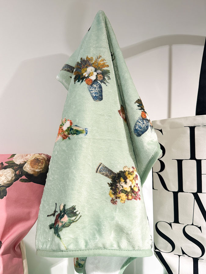 柔らかな肌ざわりが心地よいブランケット。やさしいグリーンに花のブーケ柄が映える、ぬくもりと華やかさを兼ね備えたデザインです。3,520円。