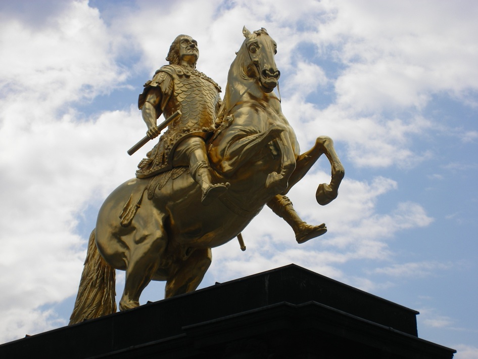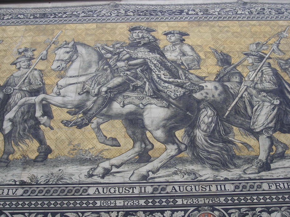 エルベ川のほとりに立つ騎馬像、102mもの壁画「君主の行列」に登場するマイセン磁器で作られたタイル絵の騎馬像、今でもアウグスト強王の存在感には大きなものがある。