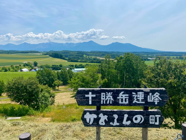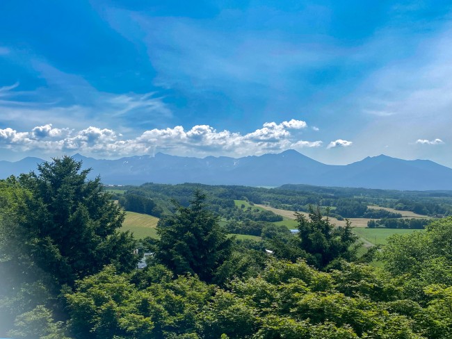 展望台の頂上からは、西にラベンダー園、東には十勝岳連峰が見え、360度の眺望。