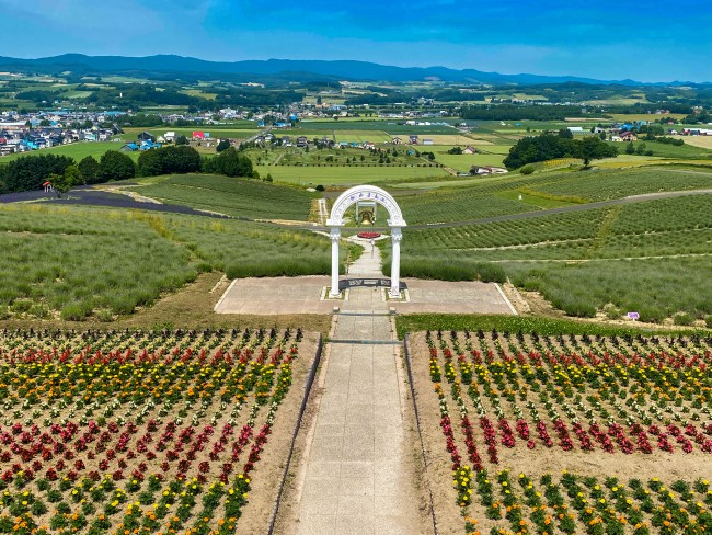 『日の出公園ラベンダー園』は、小高い丘の上にあるラベンダー園。ラベンダーのみならず、四季折々の花畑と田園風景、晴れた日には雄大な十勝岳連峰が一望できるおすすめスポットです。