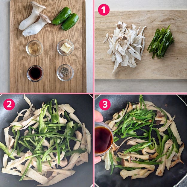 ① エリンギは石づきを落とし、縦に手で割き、ピーマンは縦半分に切って種を取り、細切りにする。