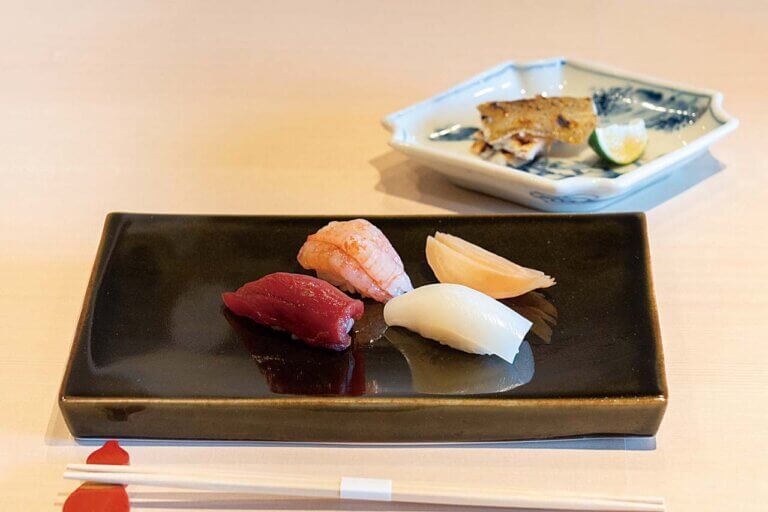 一貫ずつ提供するスタイル。つまみと握り(11,000円)には、寿司12貫前後につまみ3種が付きます。写真の一品は、地魚のフナベタの一夜干し。