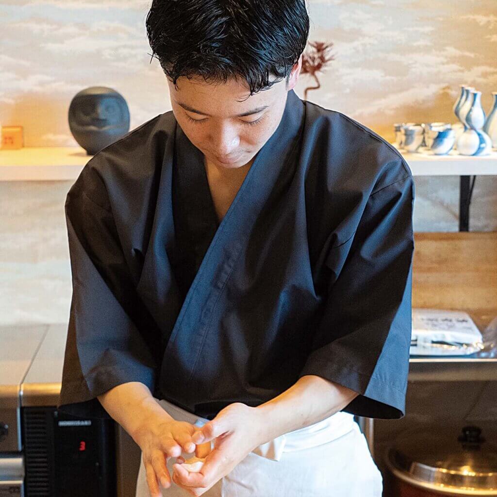 提供するのは、旬の鮮魚を使ったおまかせ握り。店名は「歌舞伎舞台の裏方の黒衣のように、主役のお客様が楽しい時間を過ごす手助けを」との思いを込めているのだそう。カジュアルながら洗練された和の空間で、寿司はもちろん、県内外の日本酒とのペアリングを楽しめます。