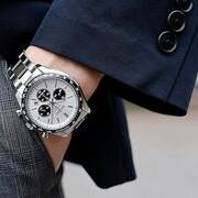 文字盤には複数のサブダイアルを配置。ムーンフェイズ機能に加えて、デイデイト表示なども見やすく整理されており、クラシカルな雰囲気の中に実用性を備える。直線的なフォルムのスクエアケースは、ビジネスにもカジュアルにも馴染むミニマルな印象を演出。男女問わず使いやすいサイズ感で、ペアウオッチとしてもおすすめだ。