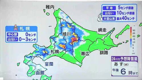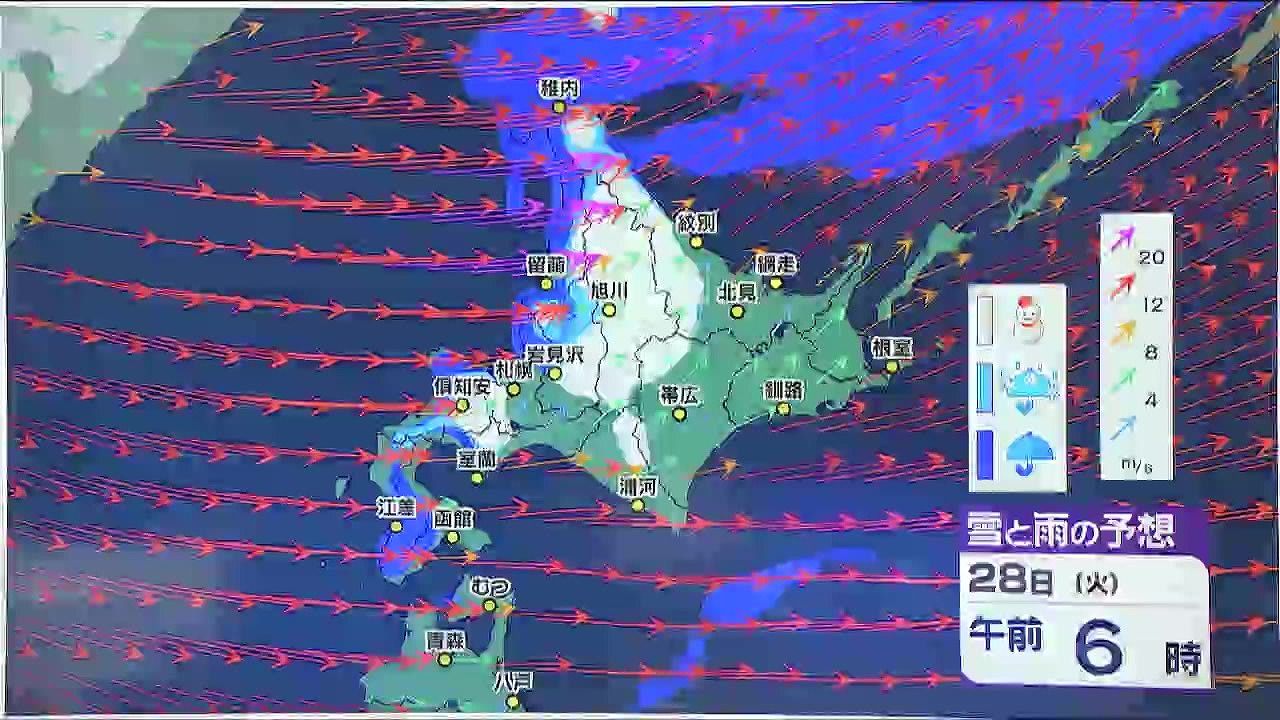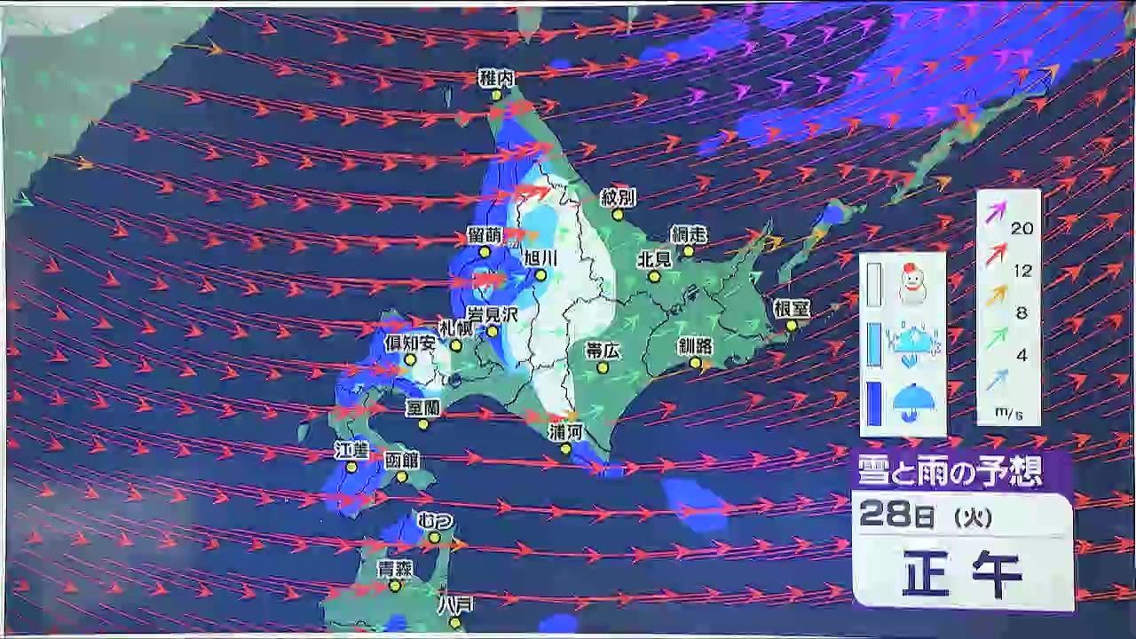 火曜日にかけて日本海側、オホーツク海側は広く雪がまじり、道北などは積もりそうです。札幌も火曜日は雪の降る時間がありそうです。