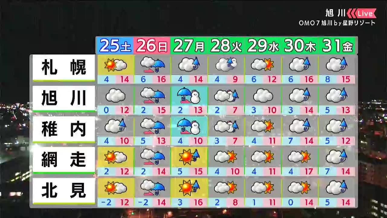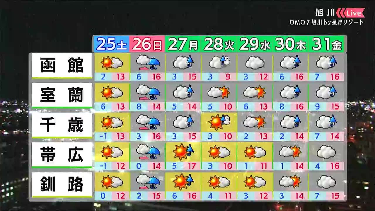 北海道のあす25日(土)の天気と、週間予報を、HBCウェザーセンターの伊藤真梨子(いとう・まりこ)気象予報士がお伝えします。