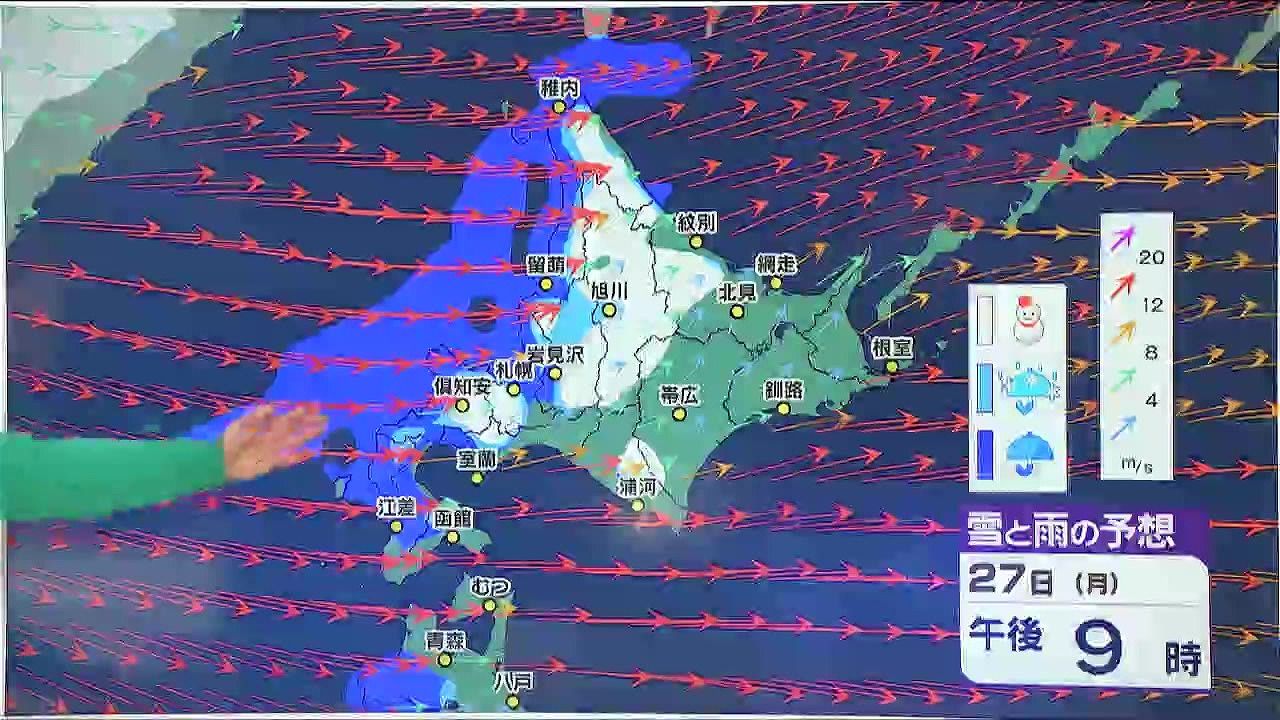 日曜日は午後を中心に雨で、月曜日は道北から雪に変わるでしょう。火曜日は寒気のピークで、札幌も雪になる時間がありそうです。また、風が強くふぶくこともあるでしょう。