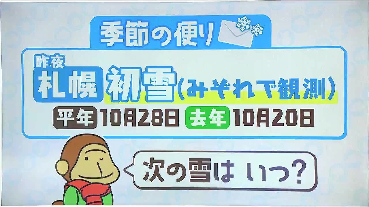 札幌、初雪になりましたね。昨夜遅く、雨がみぞれに変わって、初雪となりました。札幌の初雪の平年は10月28日で、去年は10月20日と早かったので、今年も特別早いわけではないが、今週は冬を思わせる寒さが続きましたね。