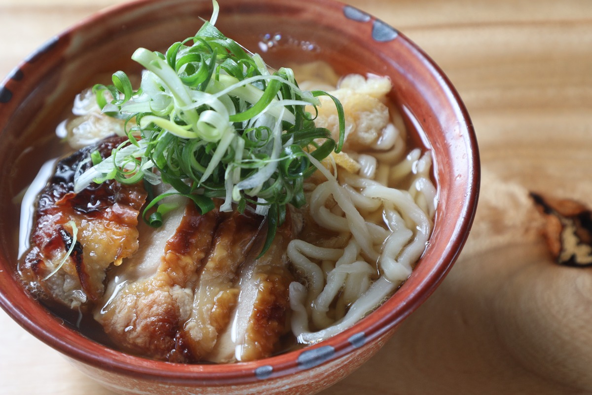 自家製麺に、昆布などの天然素材と醤油のみで仕上げたダシをそそぎ、特製タレに漬け込みじっくり焼き上げた鶏肉を豪快に盛り付けた[阿波尾鶏南蛮うどん]。