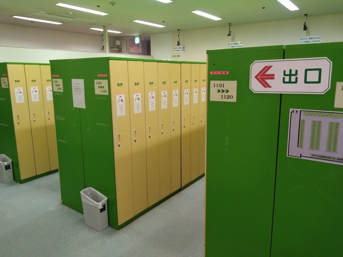 ロッカールー厶に到着。グリーンのロッカー、シブいっ、大きめ。タオルとタオル地のマットを持って、いざサウナへ。