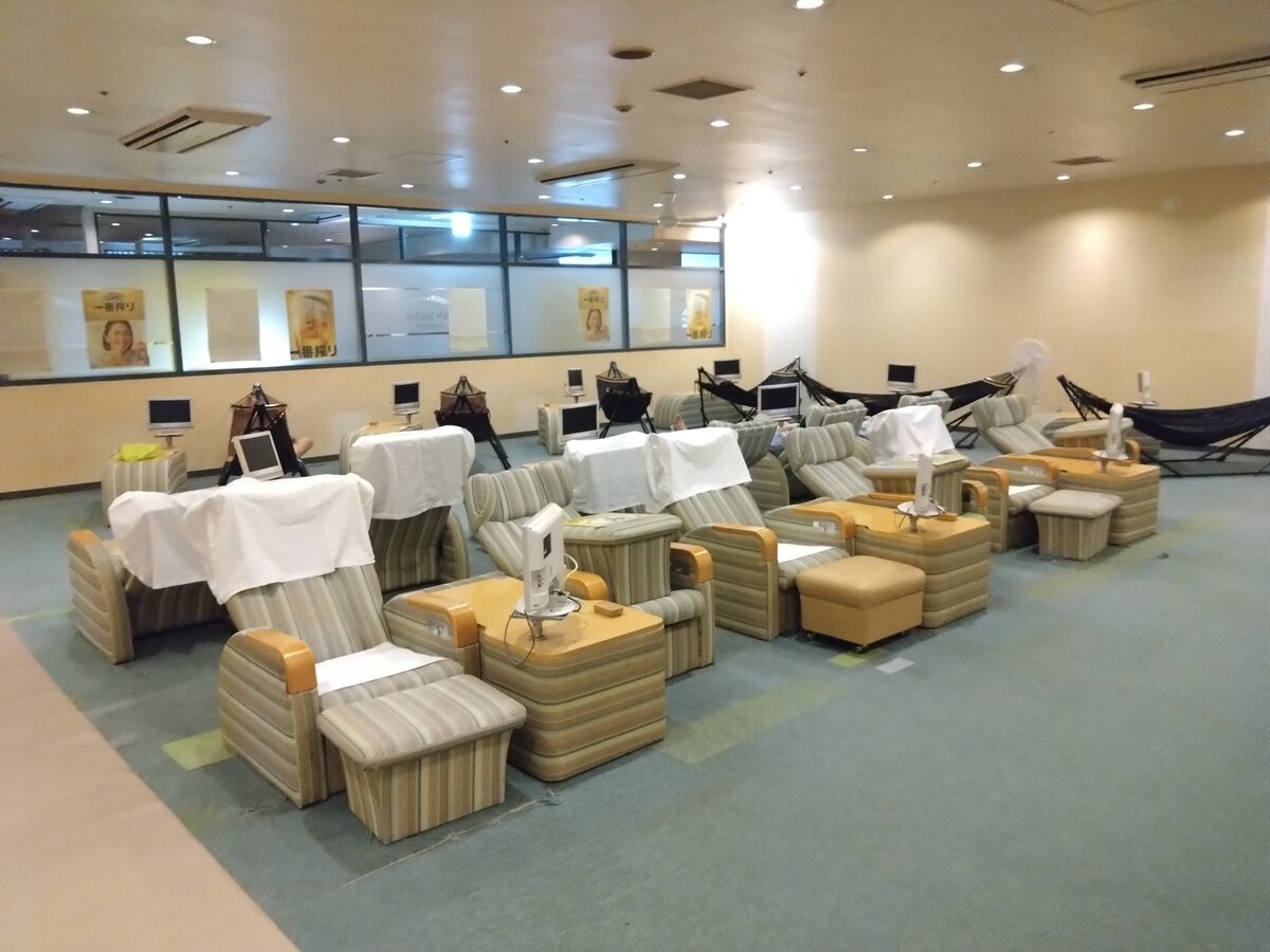 で、圧巻は内気浴「休憩スペース」。なんすか、この巨大なツインファン(笑)
