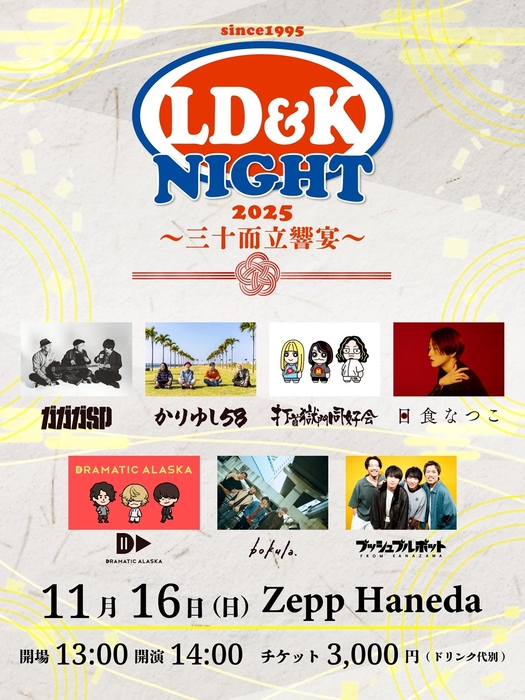 音楽レーベル・LD&Kの30周年を記念したイベント『LD&K NIGHT 2025~三十而立響宴(みそじりつきょうえん)』を11月16日(日)、Zepp Hanedaで開催する。出演アーティストはガガガSP、かりゆし58、打首獄門同好会、日食なつこ、ドラマチックアラスカ、bokula.、プッシュプルポットの7組。LD&K所属アーティストが世代、ジャンルを超え集結し、一夜限りの祝祭を楽しみ、楽しませてくれるスペシャルライブだ。