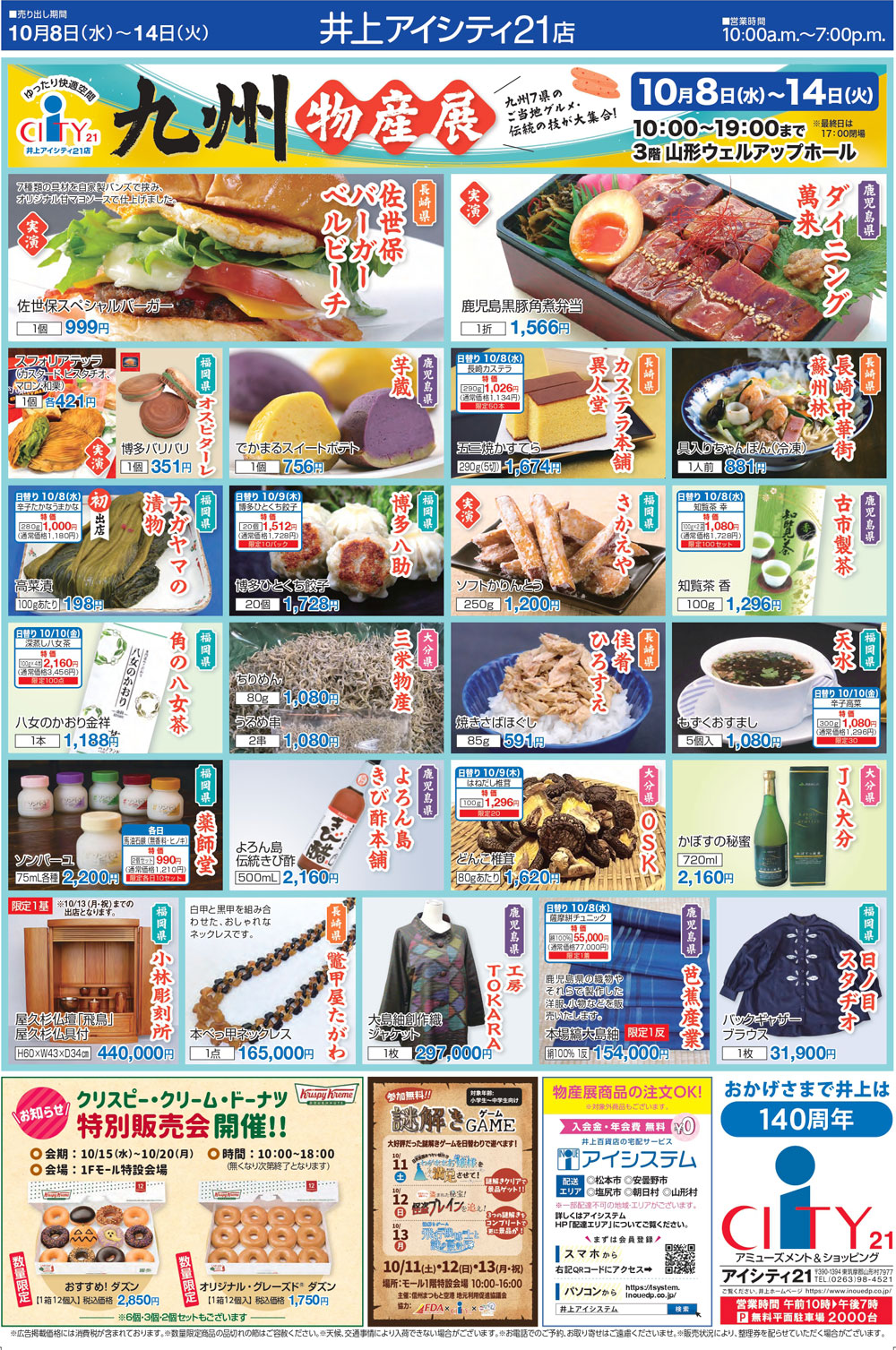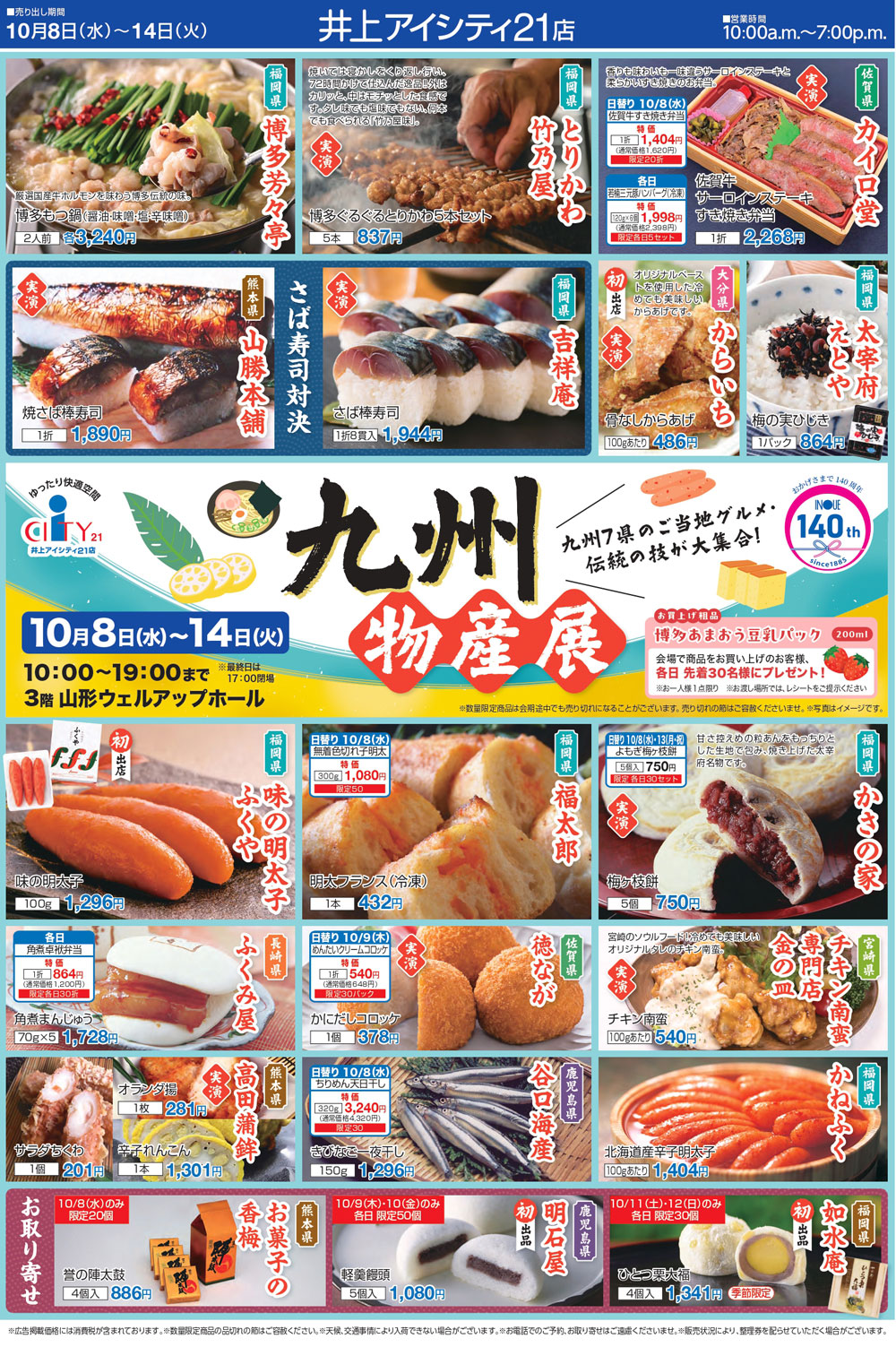 10/8(水)~10/14(火)『九州物産展』博多もつ煮・さば寿司・佐賀牛・佐世保バーガー・太宰府名物など九州のご当地グルメが大集結!「井上アイシティ21」@長野県 山形村