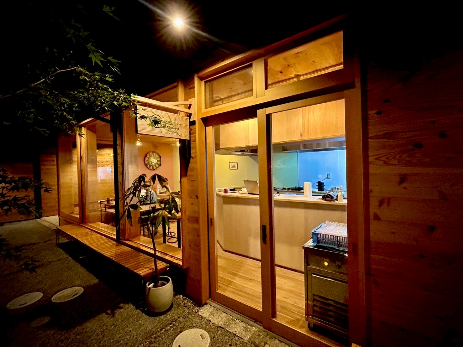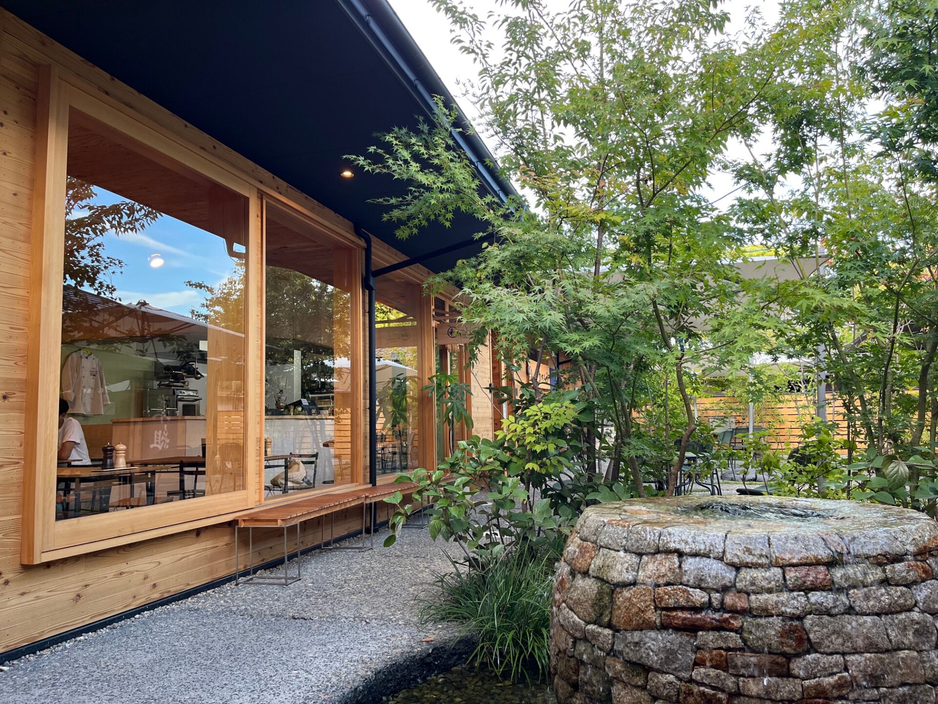 スタッフのDIYで手掛けられたという新店舗の内装は、「和」にふさわしく木の温かみが感じられ、中庭の木々や芝生の緑ともよく調和していました。
