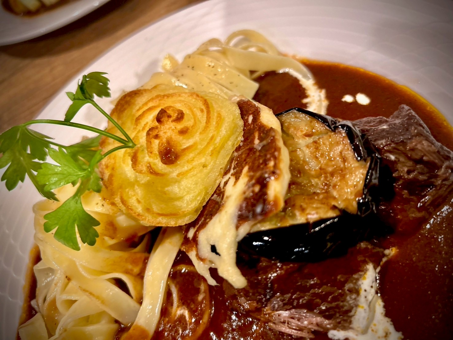 付け合わせには、旬のナスに吉田牧場のカチョカバロ、マッシュポテトと、目にもおいしくボリュームも満点です。タリアテッレのパスタによく合うソースは、バゲットと一緒に最後の1滴までしっかり味わいました。