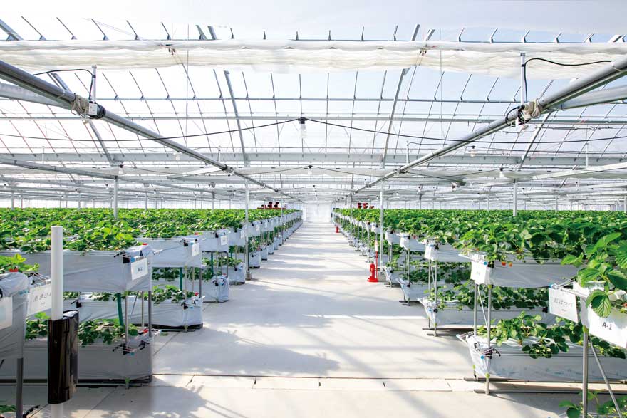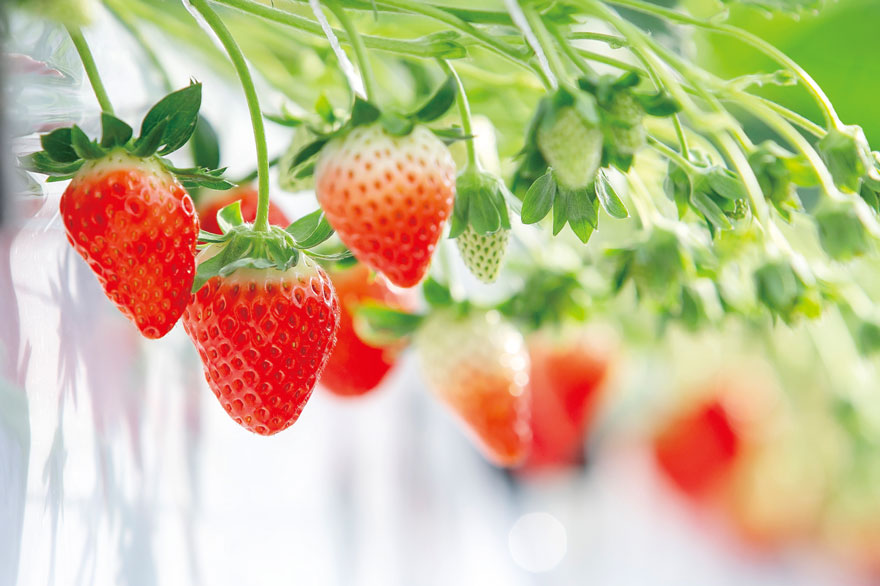 高設ゆりかご栽培で立ったままイチゴ狩りが楽しめます。床は全面コンクリート張りのため、靴が汚れる心配もなし!また、最新のシステムを導入し、減農薬で衛生的な栽培環境を実現。収穫ベンチの高さも2段階のため、子どもでも採りやすくなっています。