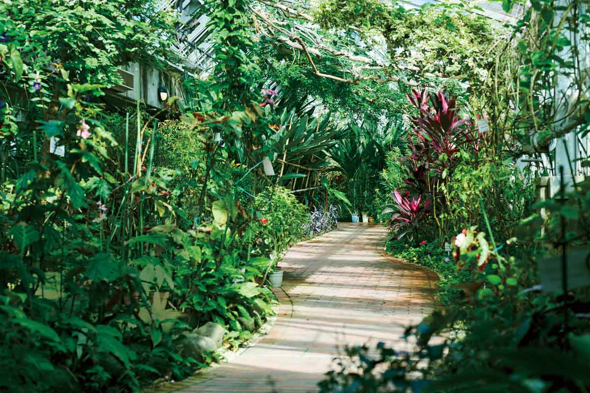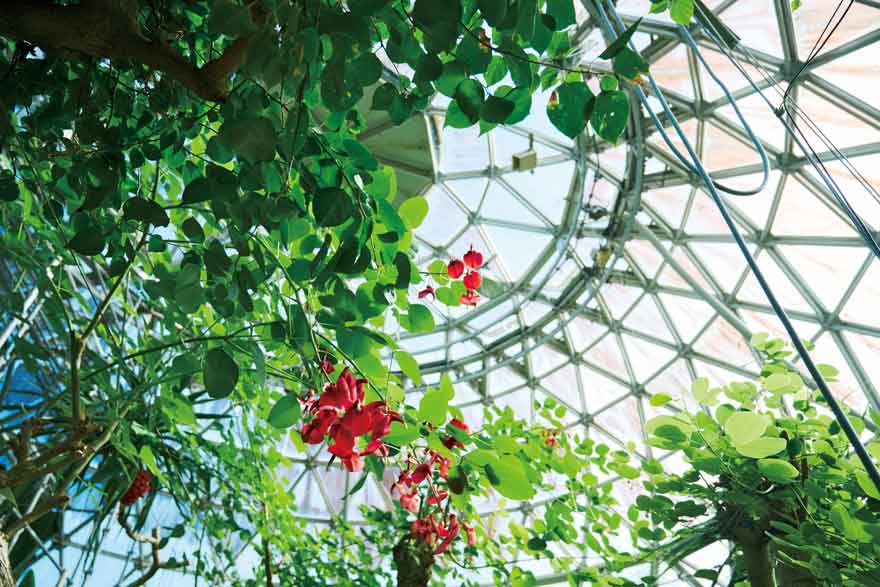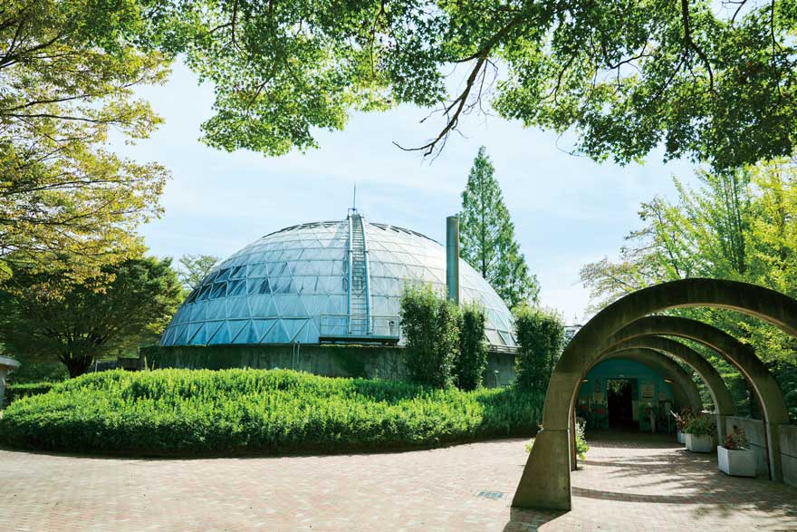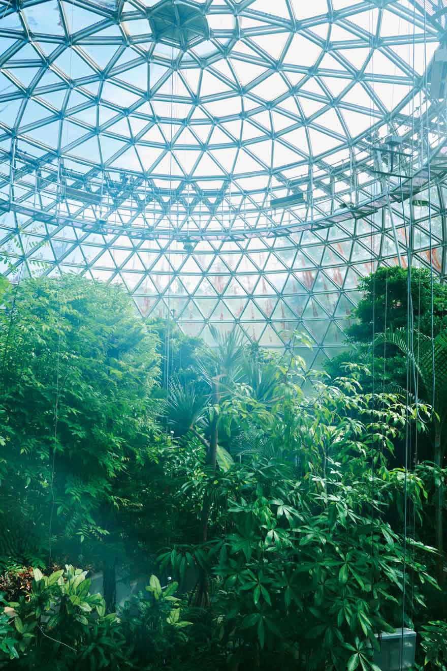 特徴的なツインドームの建物内には、約800種類の熱帯植物を展示。室内では大温室、小温室とこれをつなぐ通路を散策することができ、高さ9.5mの大温室ドームには、見上げるほど高い植物が鮮やかに広がります。