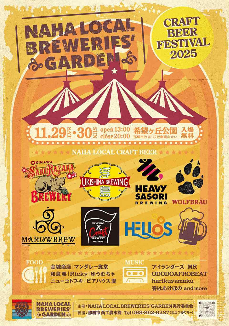 場所:希望ヶ丘公園(桜坂劇場向かい) 日程:11月29日(土)〜11月30日(日) 時間:13:00~20:00 (両日) 出店店舗 【クラフトビール】 ・SAKURAZAKA BREWERY ・ヘリオス酒造 ・UKISHIMA BREWING ・KANEHIDE CRAFT BREWERY ・WOLFBRAU ・HEAVYSASORI BREWING ・MAHOWBREW 【foood】 ・ゆうむちゃ(焼き鳥) ・マンダレー食堂(ミャンマー肉料理) ・クラフトビアハウス麦(スーチカーなど) ・金城商店(ソーセージ・シャルキュトリ) ・ニューコトブキ(ラーメン・チャーシュー) ・和食 要 (肉料理) ・Ricky (唐揚げ) 【ライブ】 ・ODODOAFROBEAT ・MR ・アマゾン松田 ・The Islanders ・HARIKUYAMAKU ・春はあけぼの ・プアミリミリ