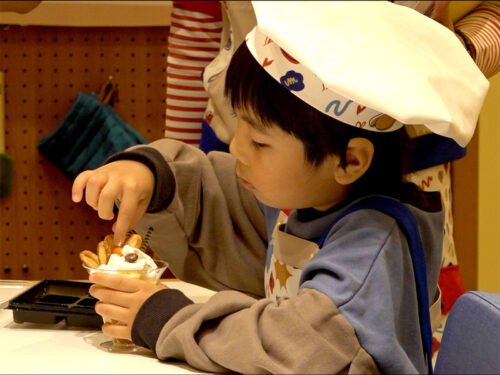 オリジナルのキャラクターパフェをデザインし、自由にデコレーションを楽しみました。トッピングの配置や色の組み合わせを考えながら、思い思いの「かわいいパフェ」を完成させていきます。