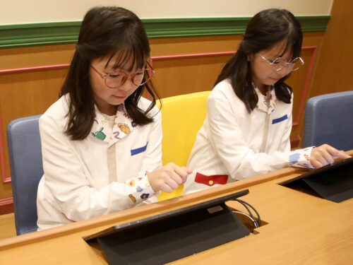 キャラクターデザイナー体験では、白衣とメガネを着用します。