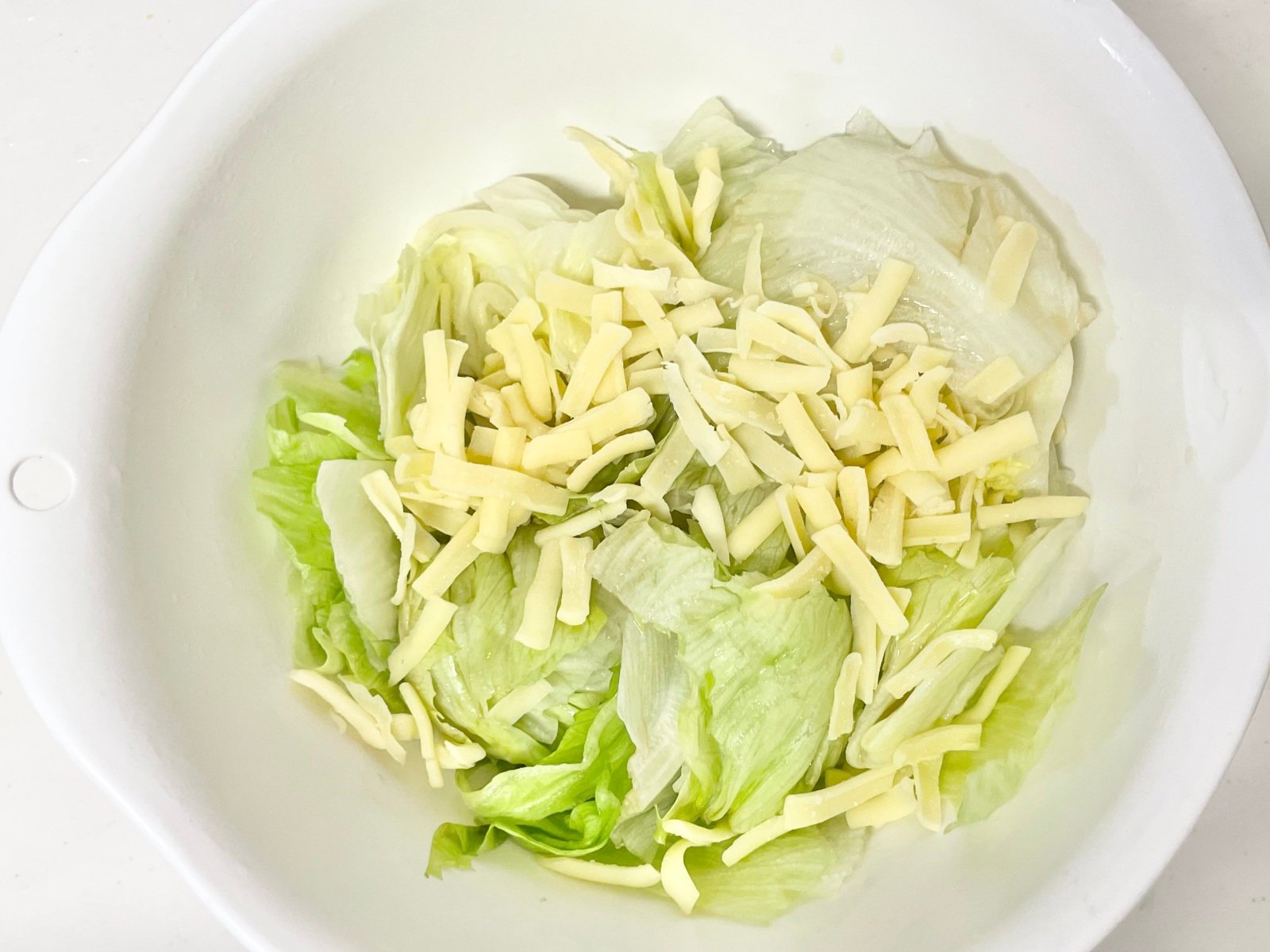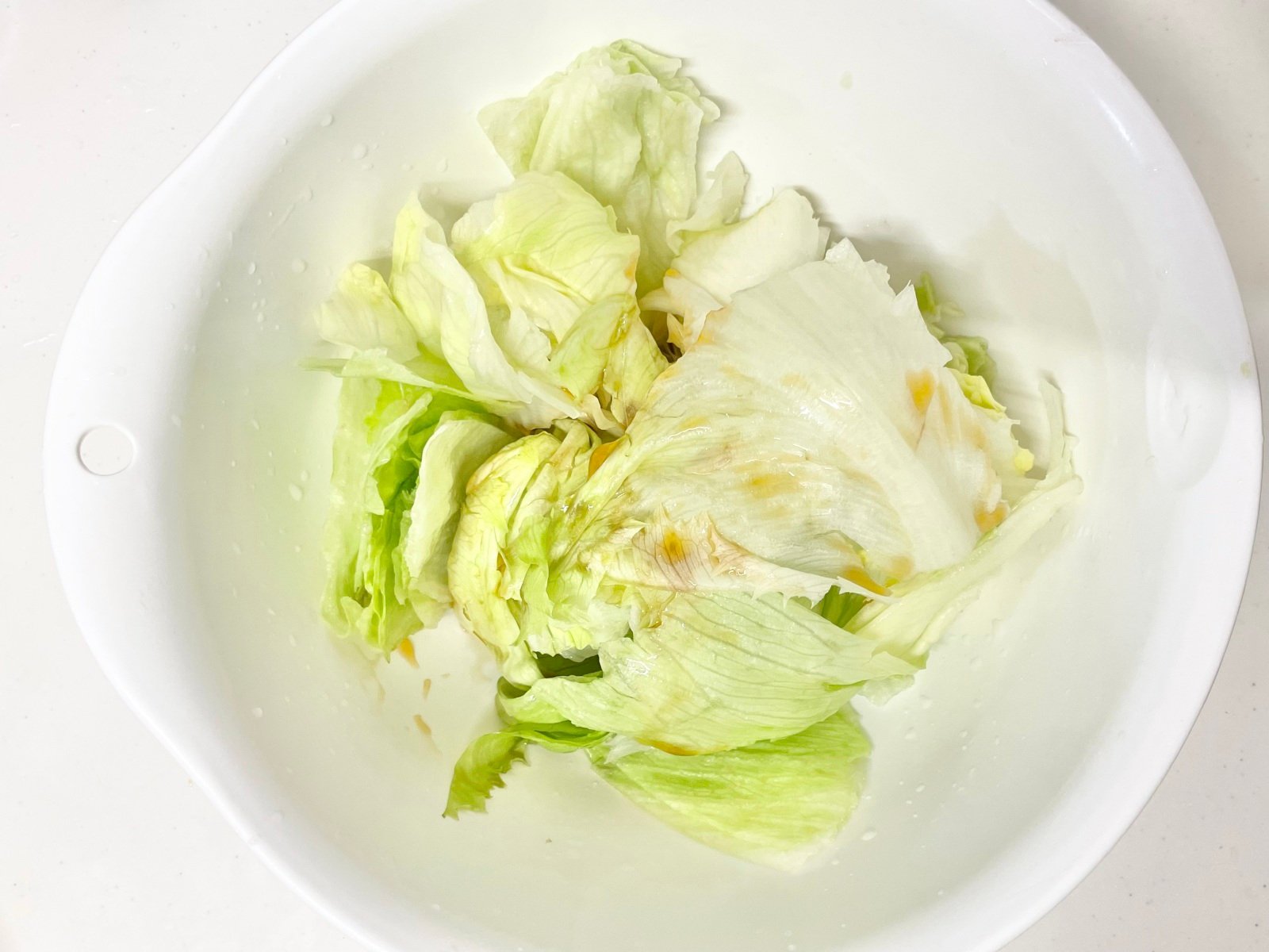 1.ボウルにレタスをちぎり、めんつゆをまわしかけます。