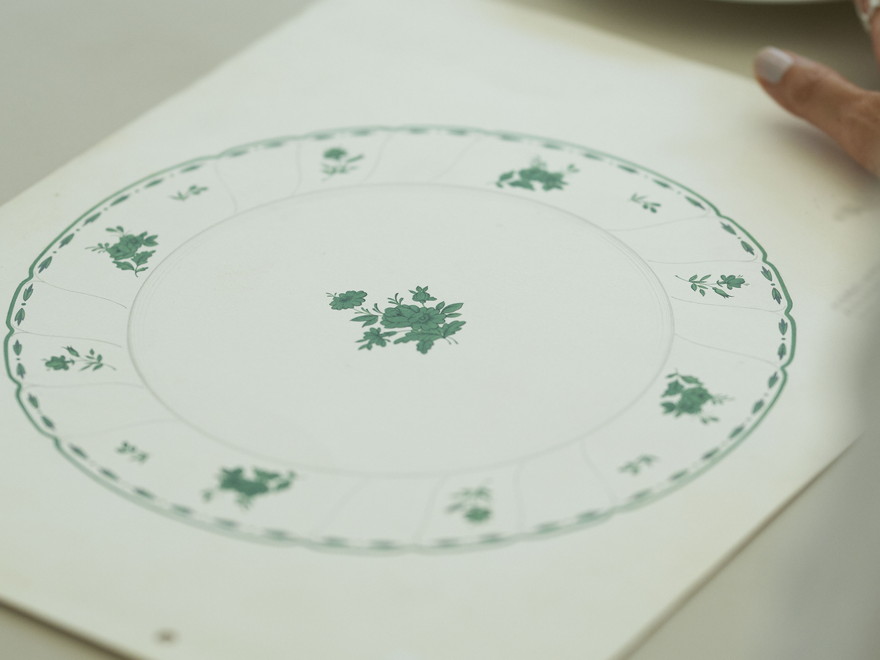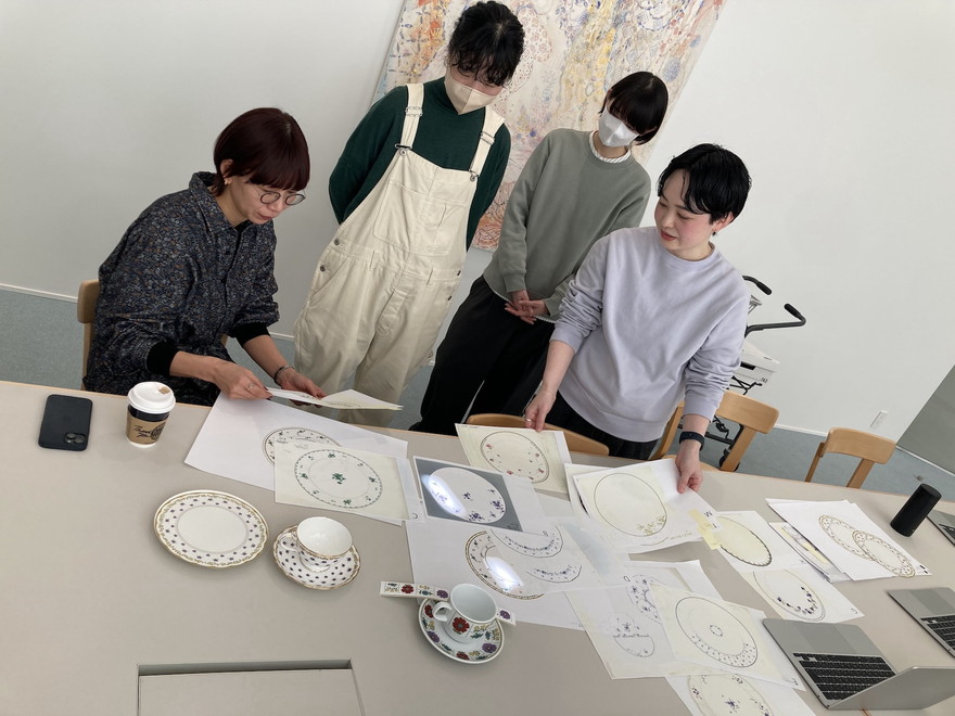 残っていた当時の資料はプレートの原画1枚のみのため、カップとケーキ皿の型に合わせて配置や大きさを細やかに調整。カップは原画が存在しないため、余白が気になる部分にオリジナルのモチーフを加え、実際にカップに貼り付けバランスを確かめながら緻密にデザインを施しました。