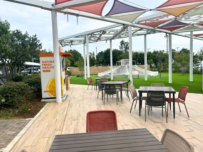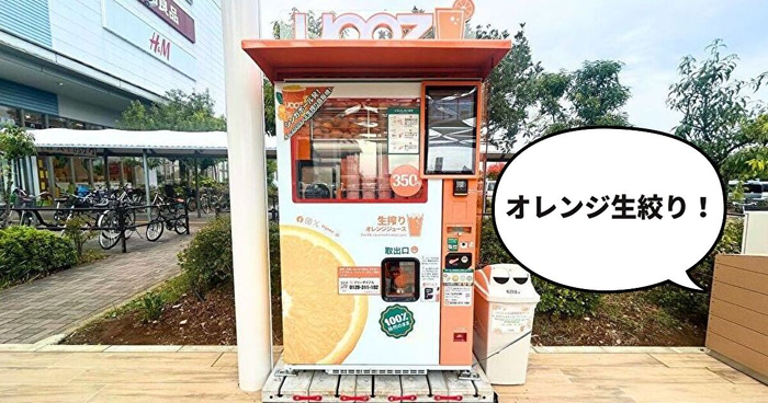 ここにも登場!イオンモールむさし村山の新スポット『つむぐいこいのひろば』にオレンジ生絞りの自販機があったので買ってみた