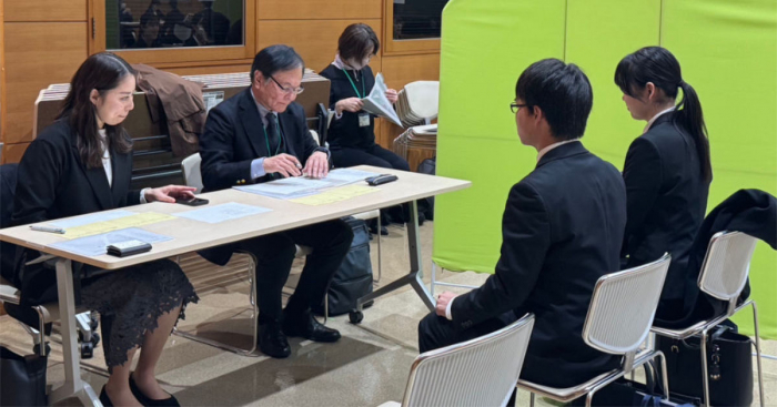 一般企業コースでは、企業の人事担当者等による模擬グループディスカッションと模擬集団面接が行われ、地方公務員コースでは、自治体職員による模擬集団討論と模擬集団面接を実施。