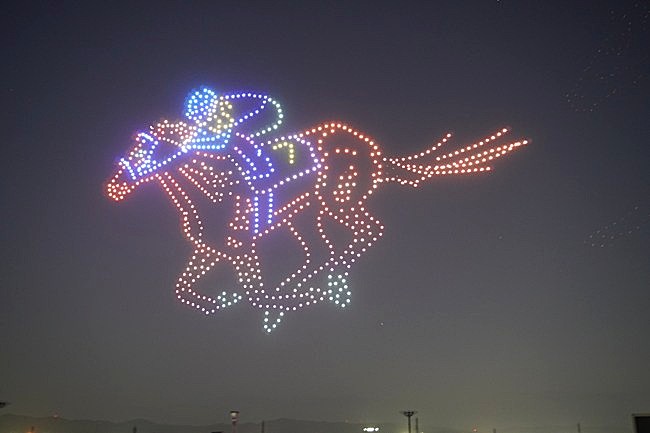 イベントでは、1,500機のドローンによるショーが行われます。光の演出とともに、躍動感あふれる競走馬の姿が描き出されます。