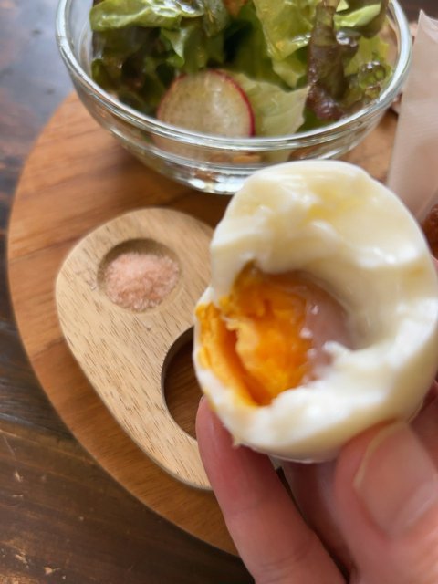 木製のエッグスタンドにはピンク色の岩塩も添えられ、全体的にシンプルではありながら、一つ一つにこだわりも感じるモーニングセット。ぼんやり外を眺めつつ、ゆったり貸切状態でモーニングいただきました(笑)