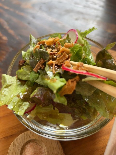 フレッシュなサラダが少しあるだけで嬉しいですね。ラディッシュの彩りやフライドオニオンのコクもプラスされつつさっぱりと。