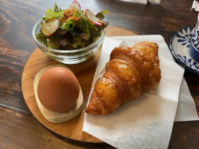 木製の円形プレートに香ばしく焼かれたAOPバタークロワッサン、ゆで卵、ミニサラダが品よく並んでいます。