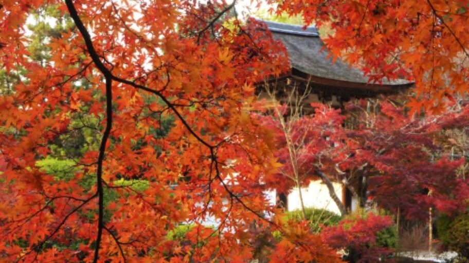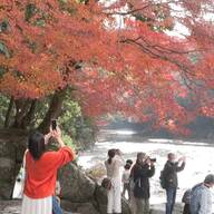 秋になると約3000本のカエデが社殿の朱色と競うように朱く燃え立つ。