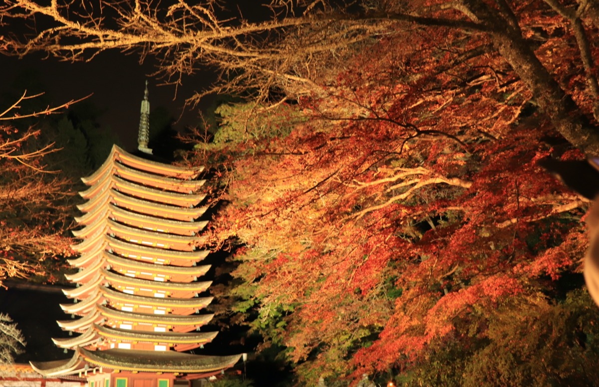 紅葉の時期には重要文化財の大小さまざまな社殿と3000本の紅葉がライトアップされ、昼間とはまた違った幻想的な景色を楽しむことができる。