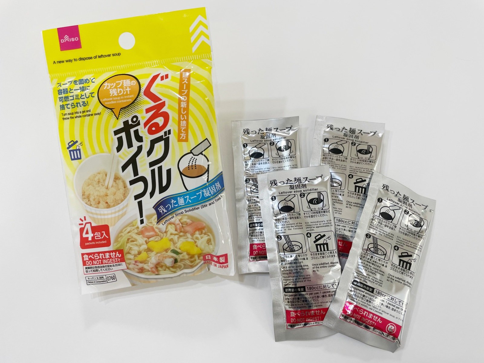 残ったスープにサッと入れてかき混ぜるだけで、スープをそのまま固めて捨てられる凝固剤。1袋に4包入りで、180ccのスープに対して1包が目安です。