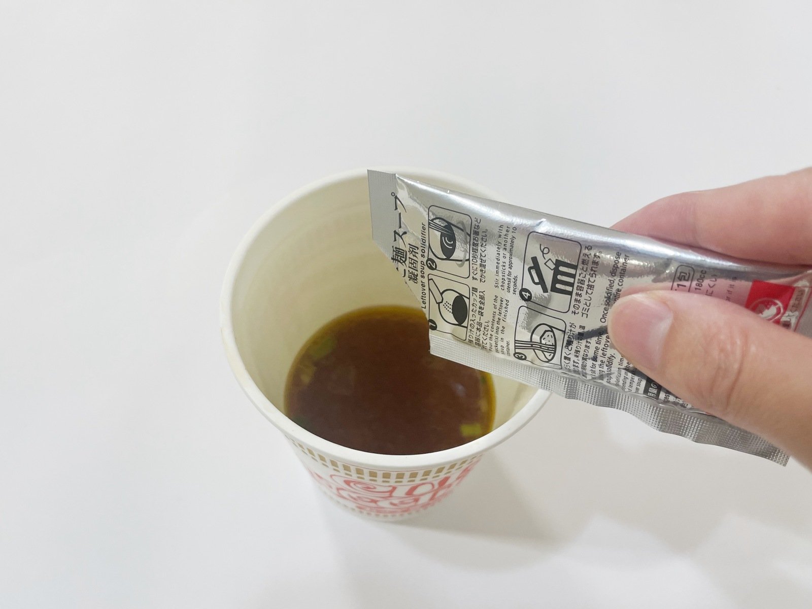 1.スープの残ったカップ麺容器に「ぐるグルポイっ!」1包をすべて入れます。180cc以上ある場合は、追加してください。