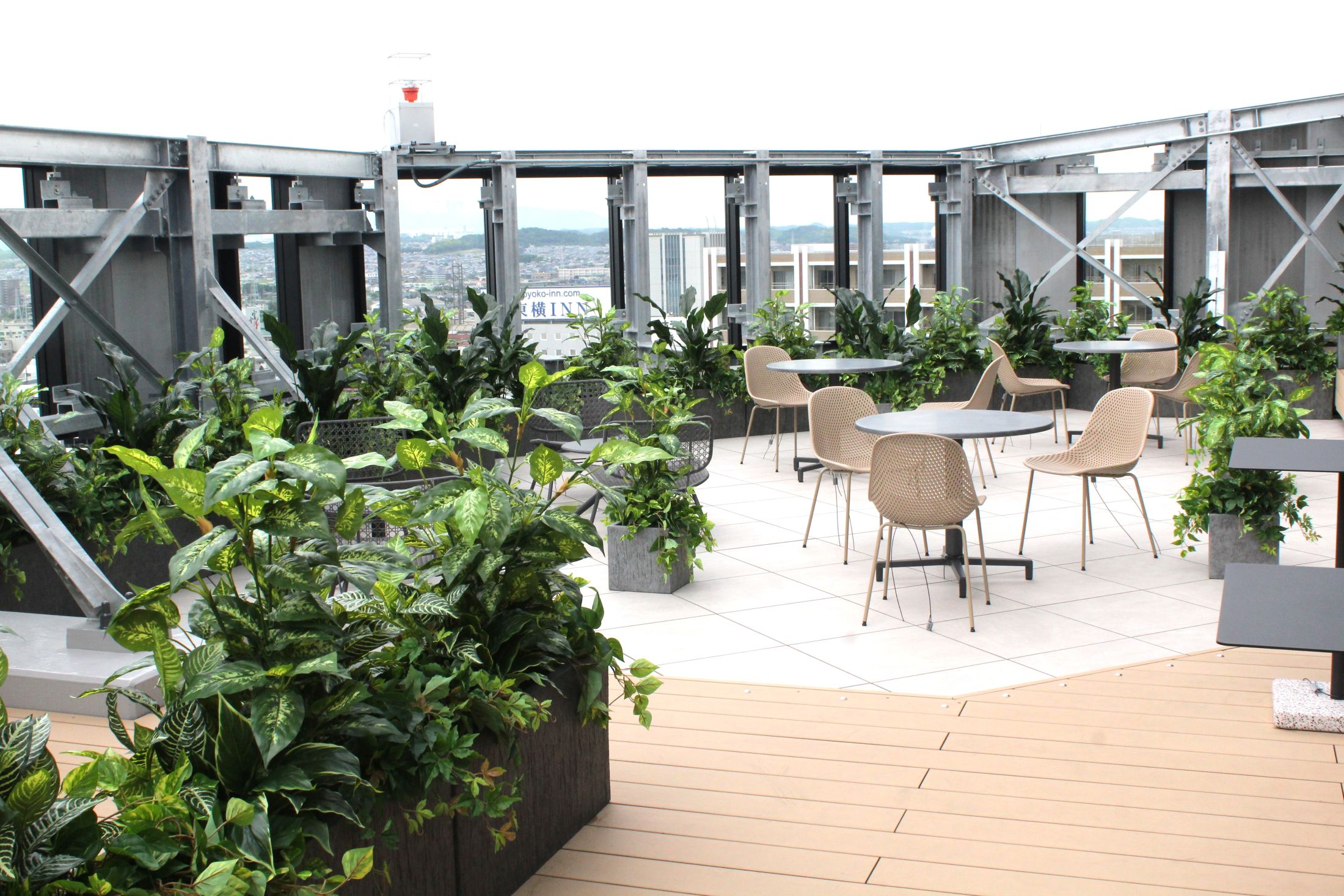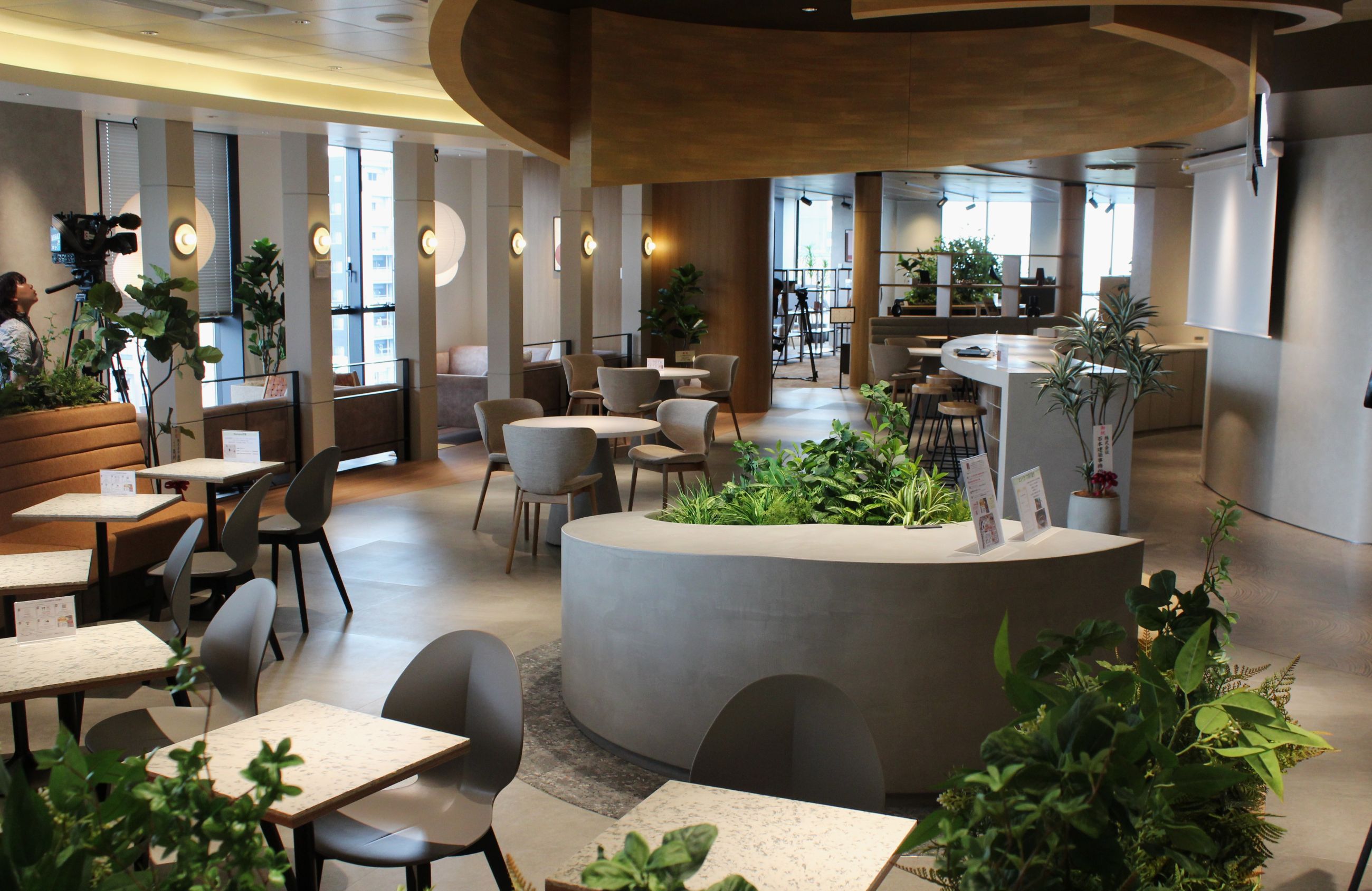 県内の新築テナントビルでは初めて、省エネの認証の「ZEB Ready」を取得しており、従来のざっと半分のエネルギーで運用できるビルになっているという。働く人の居心地のよさの取り組みで、三重県初の「CASBEEスマートウェルネスオフィス」の認証最高位のSランクを取得している。屋上にリフレッシュスペースとしての庭を設け、9階にはくつろぎの空間になるコミュニケーションラウンジを設けた。オフィスの利用者が仕事も休憩も充実して過ごせ、ラウンジでは利用者間の交流も生まれるような運用を心掛けるという。四日市の萬古焼を使ったオリジナルの照明、鳥羽市の海岸で回収された海洋プラスチックごみの再利用材を用いた什器を使っているという。