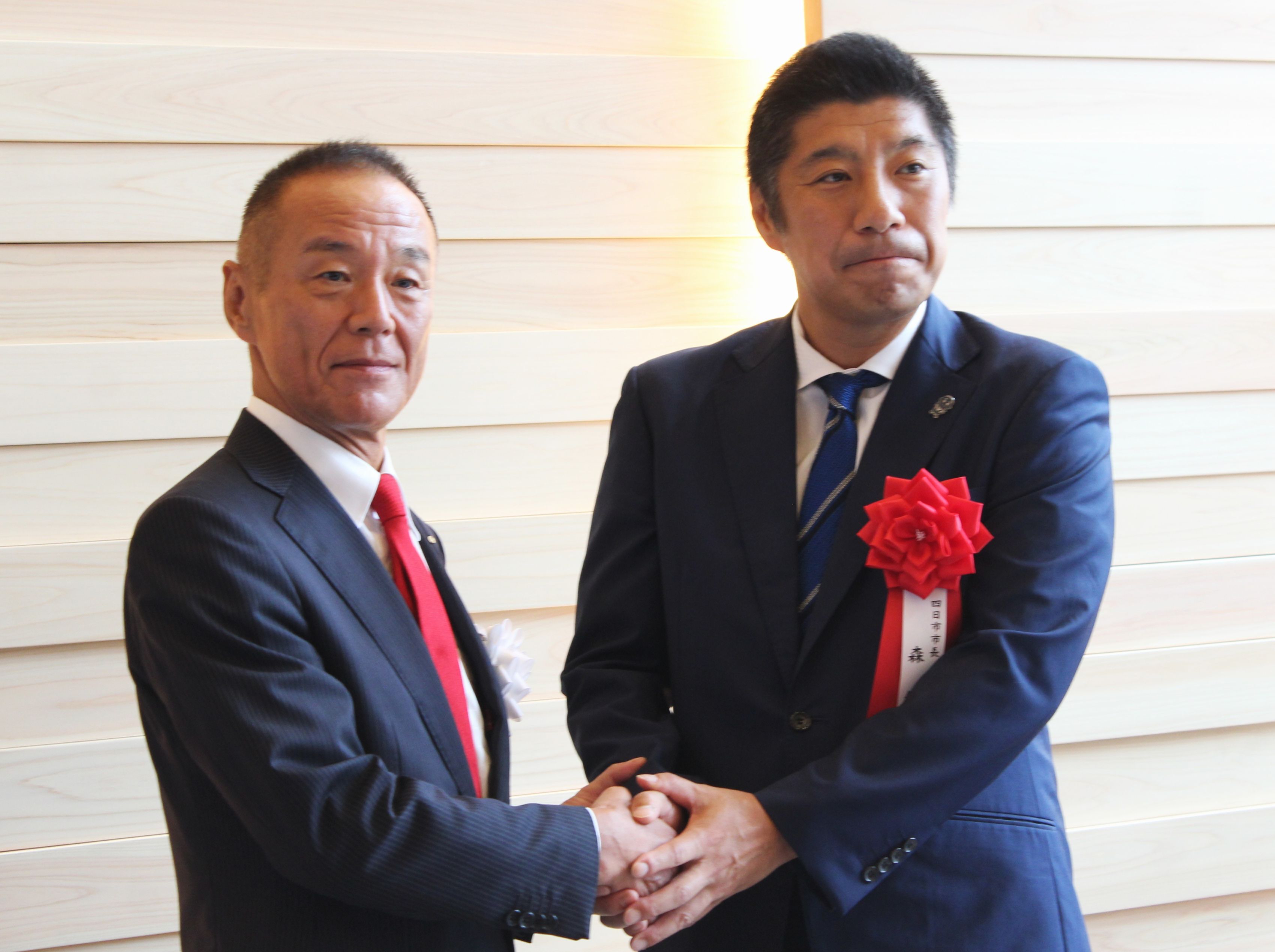 街づくりに協力すると握手する三交不動産の中村充孝社長と森智広市長