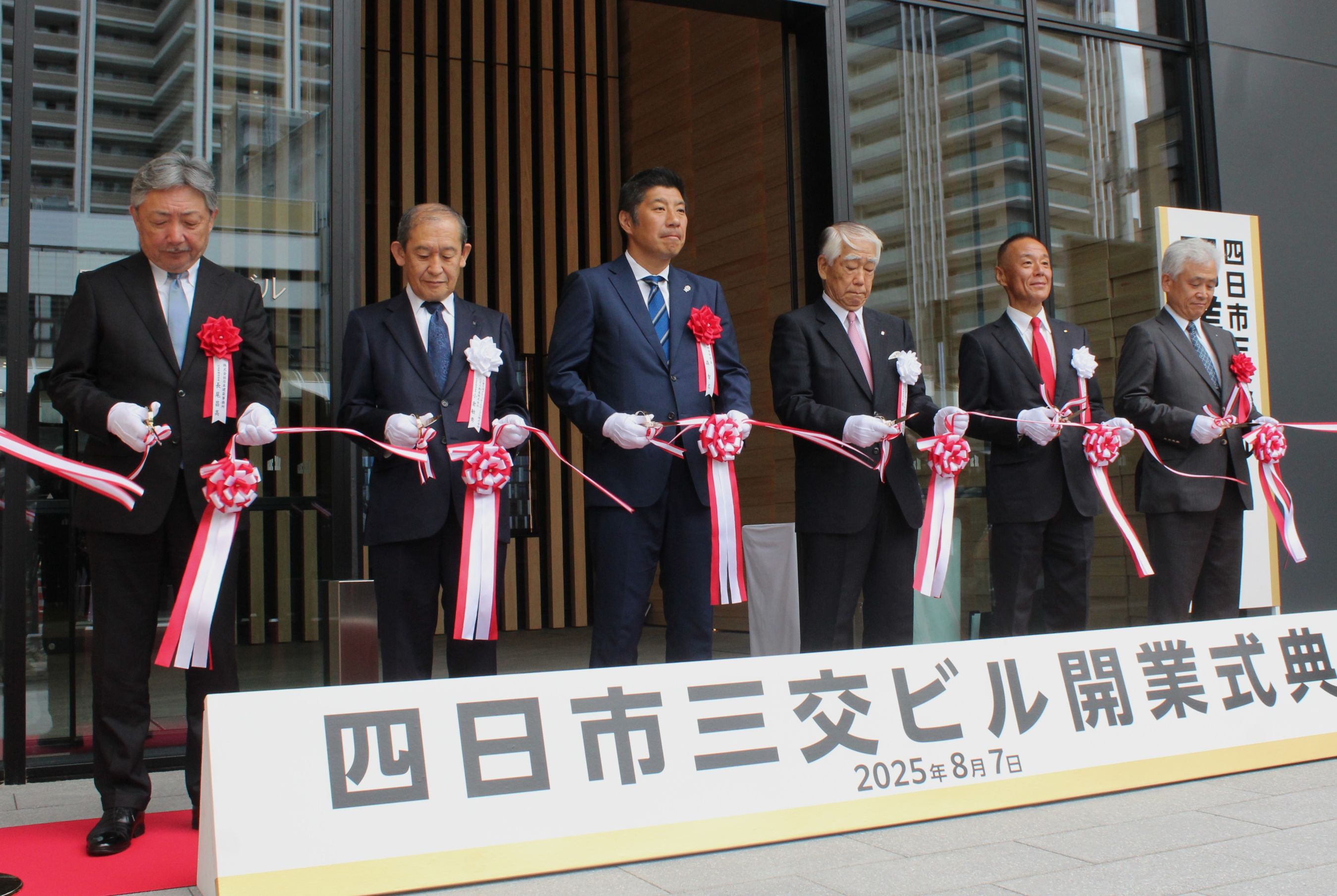 開業式典がこの日あり、再開発が進む中央通りに面したエントランスでテープカットがあった。三交不動産の中村充孝社長、森智広市長が記者との質疑などをし、中村社長は「人にやさしい、地球にやさしい、四日市らしい、の三つのキーワードを大切にした」と挙げた。中央通りのシンボルのクスノキのような大樹がしっかり立っている様子をテーマに、ビルの外観のデザインにも反映させているという。