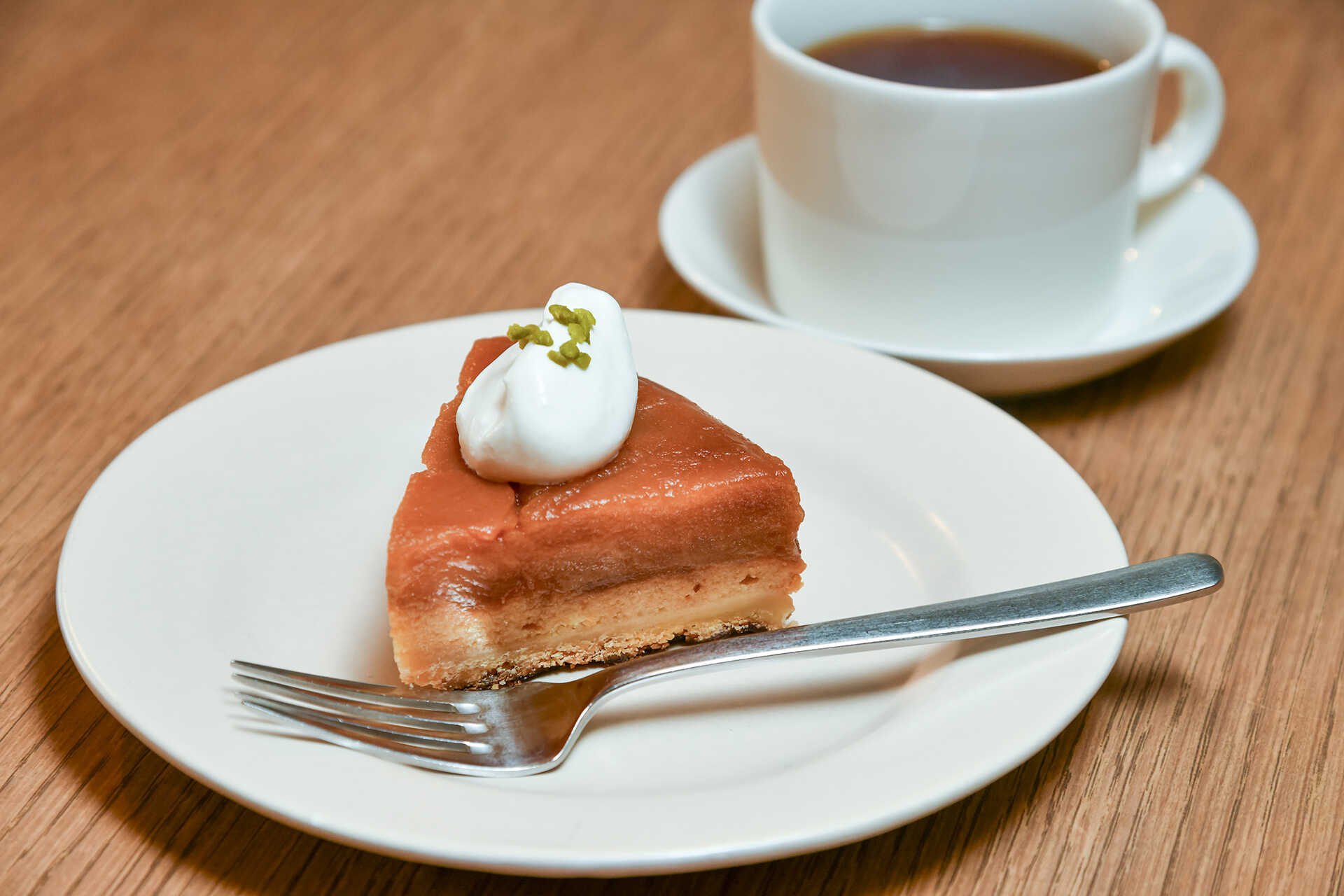 りんごのカラメル煮は、火を入れすぎず、果実感を残した瑞々しい食感。苦みは控えめで、ほのかな酸味が爽やかに広がる。発酵バター香るサブレとダマンドのタルト生地は、フォークがスッと通るほどけやすさで、生地に染みたカラメルが香ばしいアクセントに。りんごと生地の、香りと食感が心地よく調和。注文ごとに泡立てる生クリームが、ひと口の印象をやわらかくまとめてくれる。