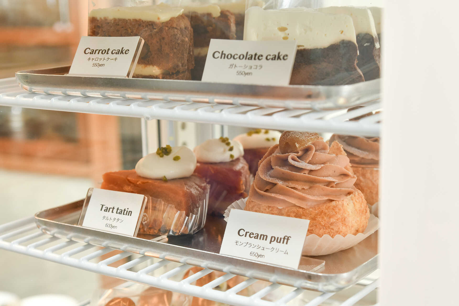 コーヒーに合わせて、軽やかであっさりとした味わいに仕上げるお菓子は、定番の「キャロットケーキ」をはじめ、愛らしいフクロウのクッキーでつくる「レーズンバターサンド」や季節のケーキが並ぶ。コロナ禍を機にお菓子の種類を増やし、テイクアウトにも積極的に対応するように。