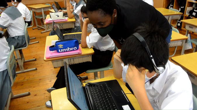 オンラインなら世界中と交流が可能。写真はインドネシアとつないだ英語授業の様子。