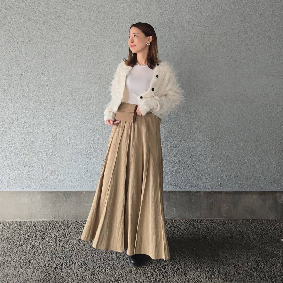 おすすめは、白のフェザー素材のカーディガンにベージュのロング丈フレアスカートを合わせたコーデ。