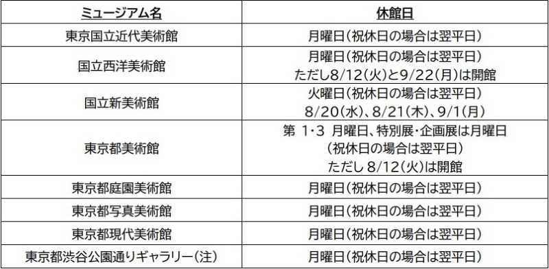 対象は、東京国立近代美術館、国立西洋美術館、国立新美術館、東京都美術館、東京都庭園美術館、東京都写真美術館、東京都現代美術館、東京都渋谷公園通りギャラリー(9月1日から28日まで休館)の8館です。期間中は週末を中心に夜間開館が行われ、特別料金やイベントが設けられる場合があるとしています。