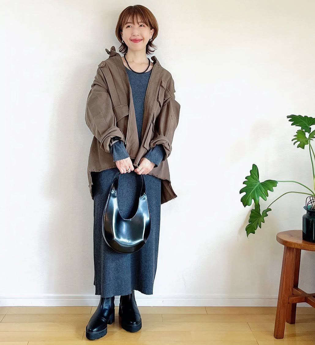 ワンピース×ミリタリージャケットの絶妙なバランスが、大人の洗練されたカジュアルコーデに。